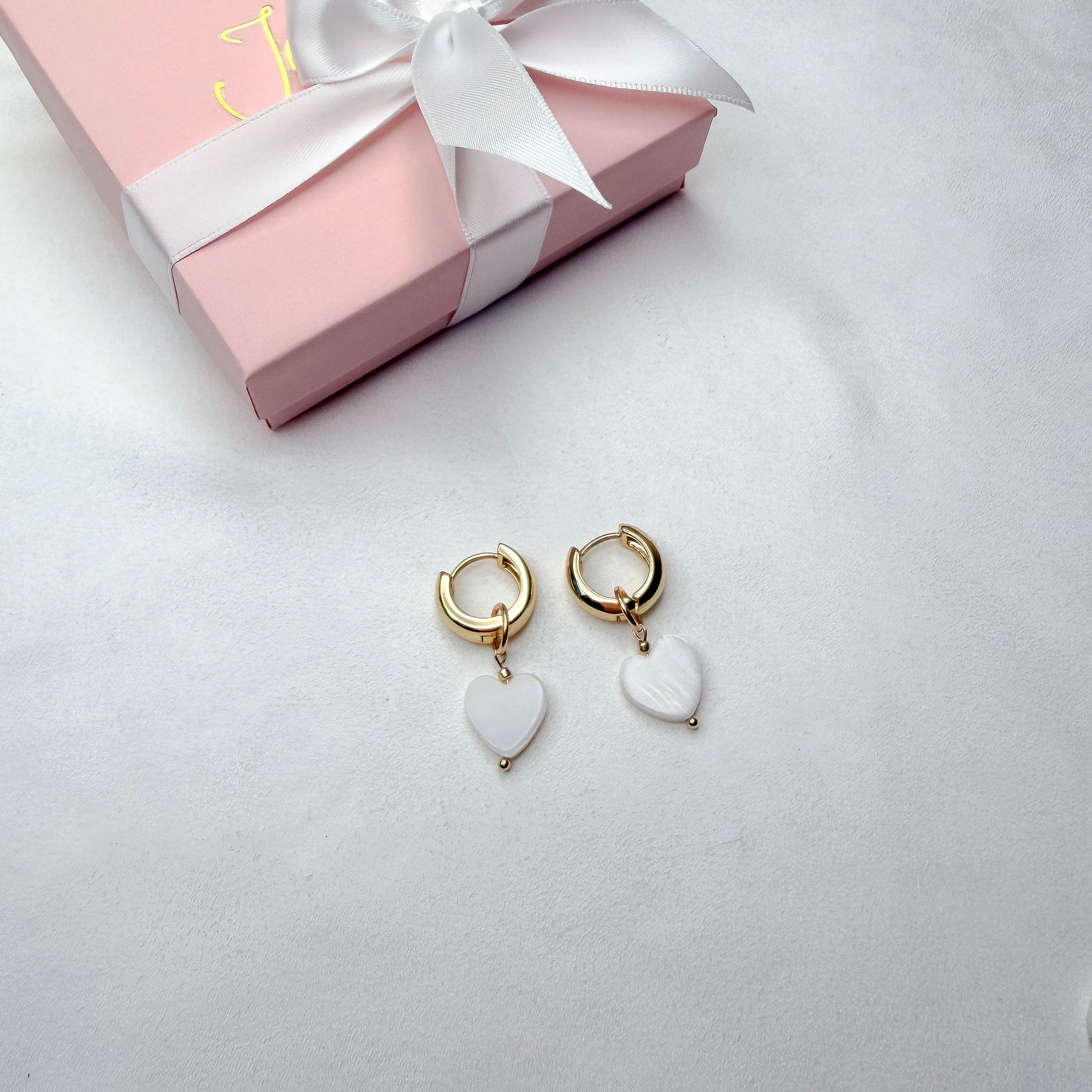 These hoop earrings are the definition of effortless elegance — clean, modern hoops with interchangeable heart charms, so you can switch the look anytime. Wear them with the mother-of-pearl heart drop for a soft, classic vibe, or remove the charm for a simple everyday hoop.