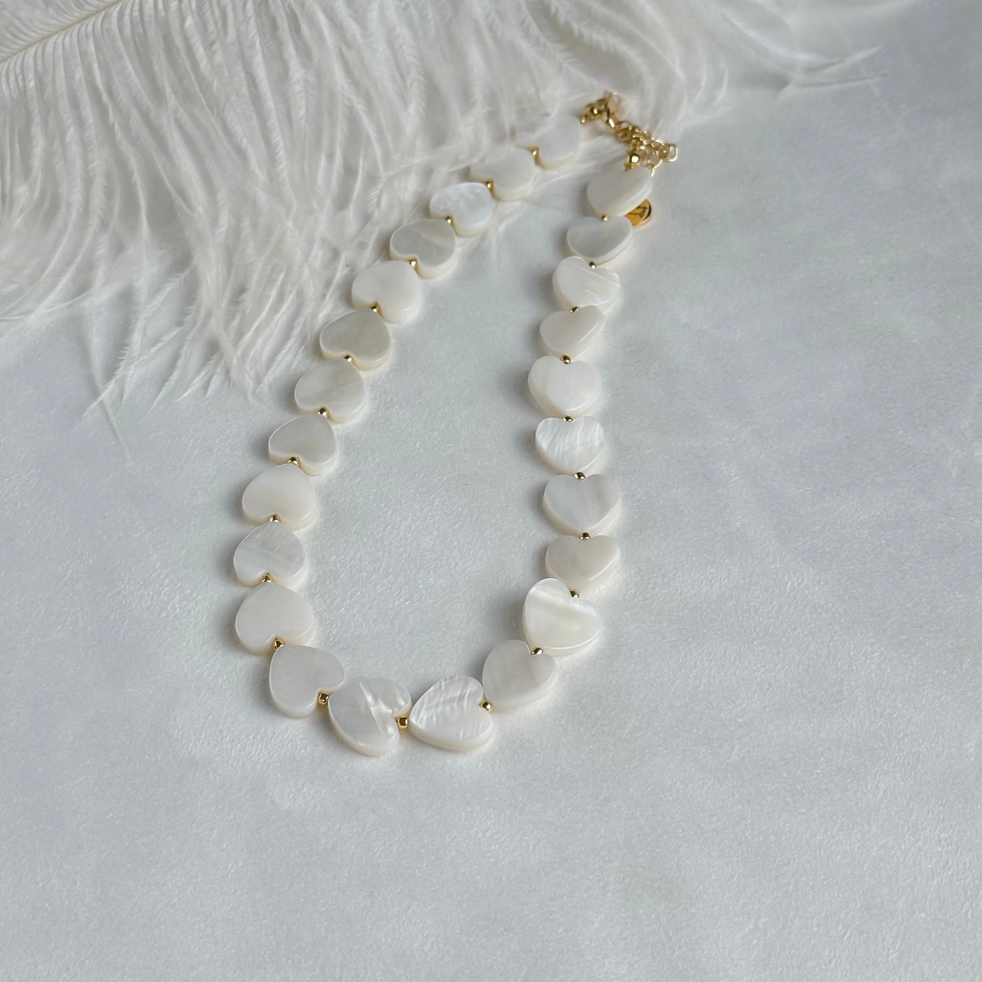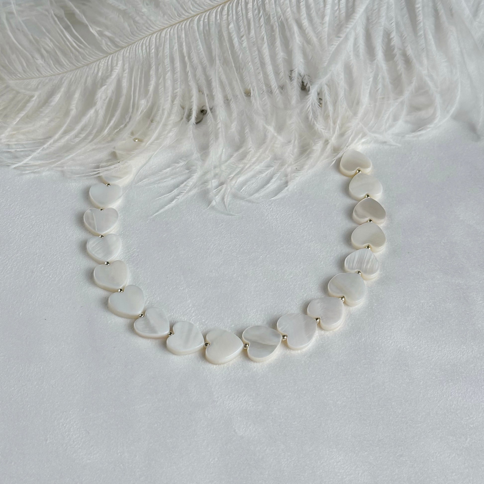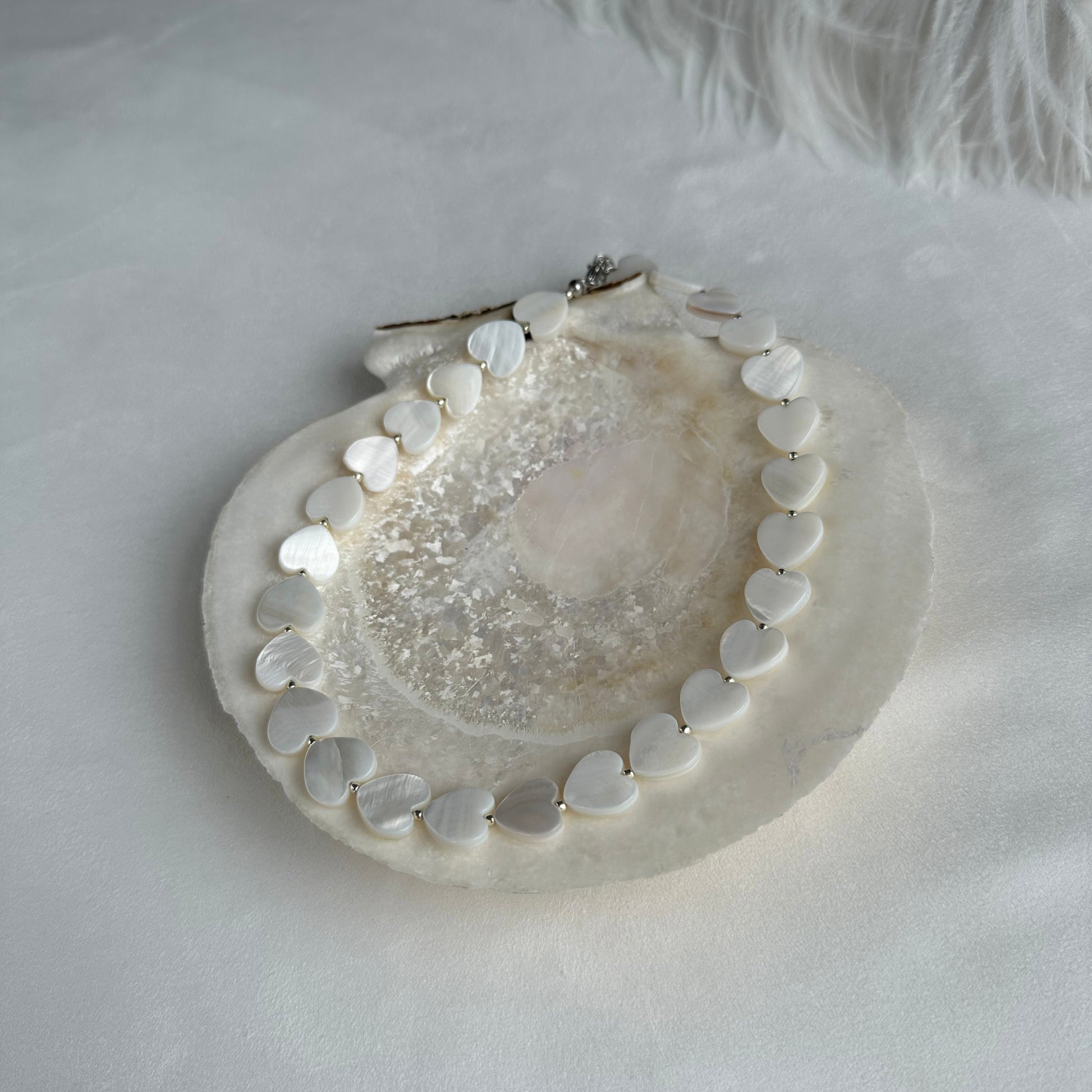 A minimalist choker with a mother-of-pearl heart — delicate, modern, and effortlessly elegant.