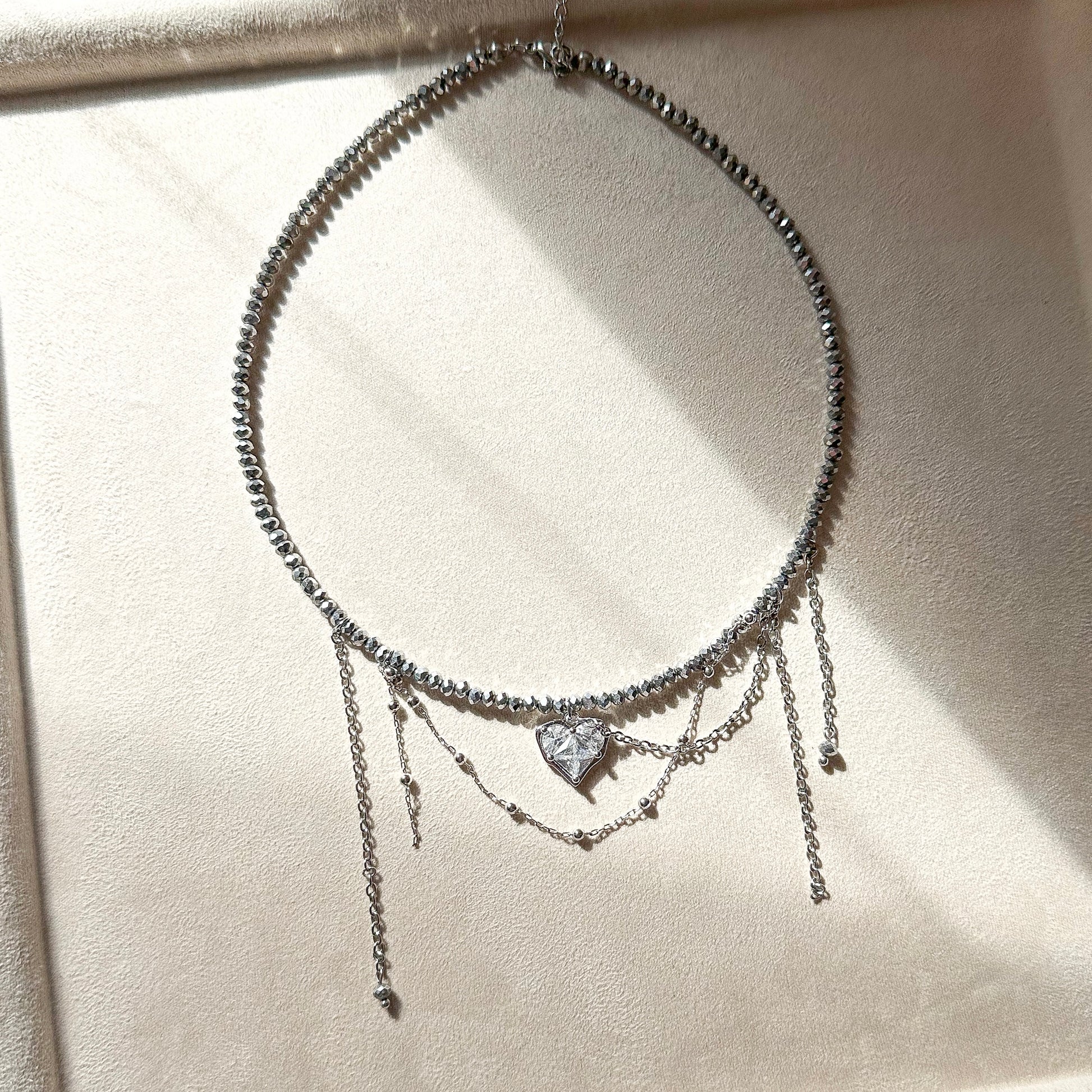 Crafted from durable stainless steel and accented with reflective crystal beads, it delivers a sleek silver shine that won’t fade or tarnish over time. The necklace features a layered asymmetric chain design, creating a dimensional look that catches the eye from every angle. The earrings come with four interchangeable pendants, giving you endless styling options – wear them matched or mix them for a trendy asymmetric style.